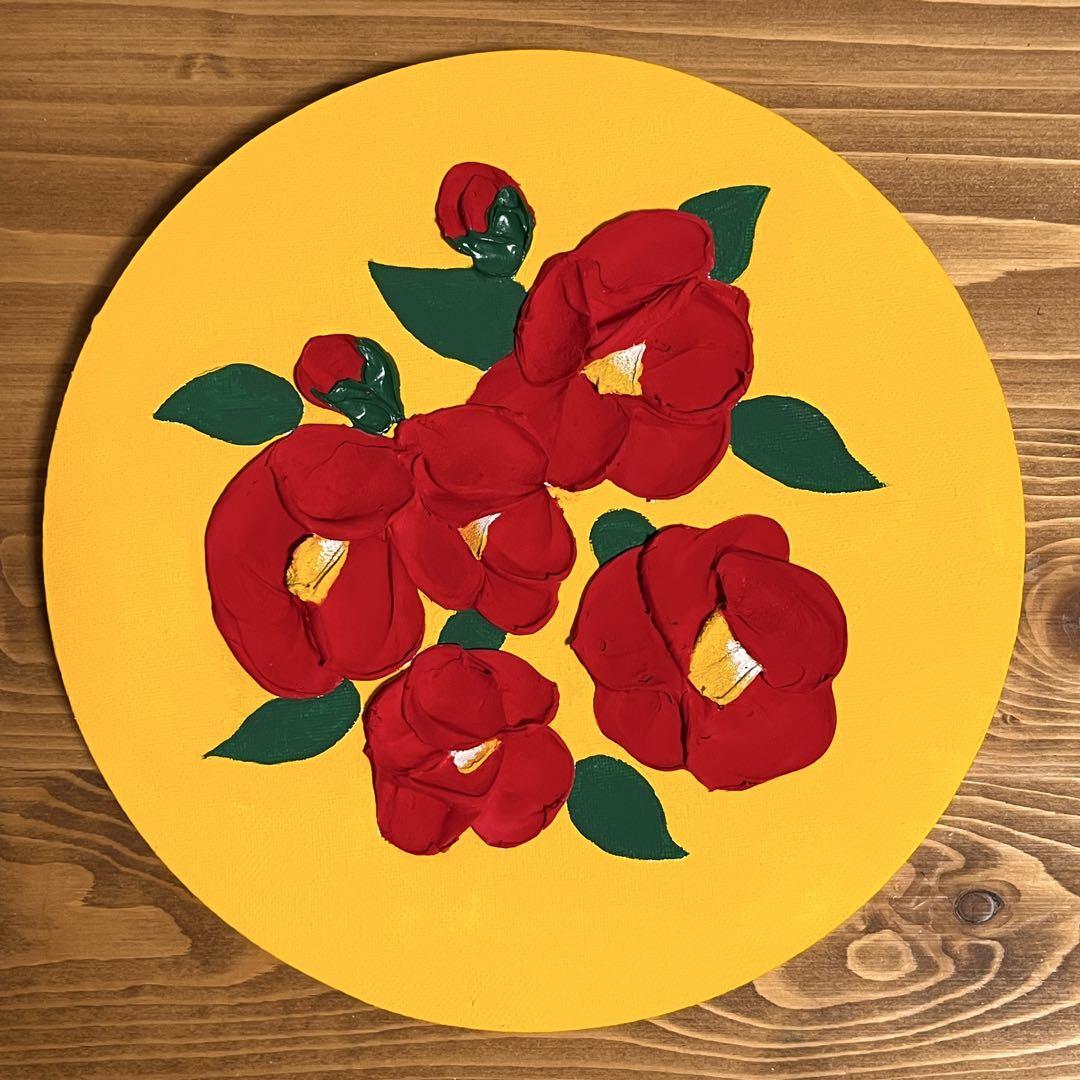 テクスチャーアート アクリル画 椿 冬 花 イエロー レッド 赤 黄色